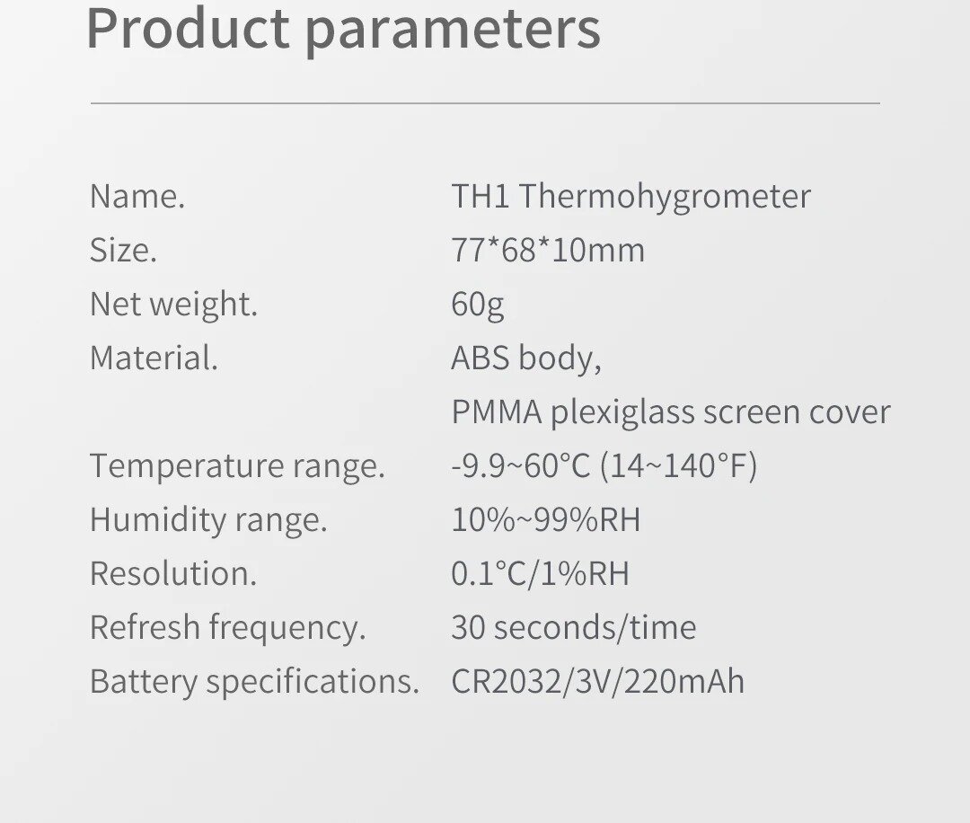 Advanced Climate Indicators: The Xiaomi DUKA Atuman Thermohygrometer provides automatic environmental climate prompts, indicating comfort, dry, and humid conditions based on temperature and humidity levels. Convenient Temperature Switching: The device allows for easy switching between Fahrenheit and Celsius, suitable for international use. Compact and Lightweight: Weighing just 60g and measuring 77x68x10mm, the device is easy to place or carry around the house. Regular Refresh Frequency: The device refreshes data every 30 seconds, keeping you constantly updated with accurate and real-time climate readings. Product Name: Xiaomi DUKA Atuman TH1 Thermohygrometer Time: clock 12/24 hour conversion Temperature Range: -9.9~60℃ (14~140°F) Humidity measurement range: 10%~99%RH Color automatic environment climate prompt: 1. Drying: any temperature, humidity less than or equal to 29%, DRY diagram is displayed 2. Comfortable: When the temperature is 18 ℃ 3. Humidity: WET diagram is displayed at any temperature and humidity ≥ 70%~95% Temperature switching: F/C switching Power supply mode: CR2032/3V/220mAh Refresh frequency: 30 seconds/time Material: ABS body, PMMA plexiglass screen cover Weight: 60g Size: 77*68*10mm 2 x Digital Thermometer Hygrometer 2 x User Manual 2 x Glue Sticker 4 x CR2032 Batteries