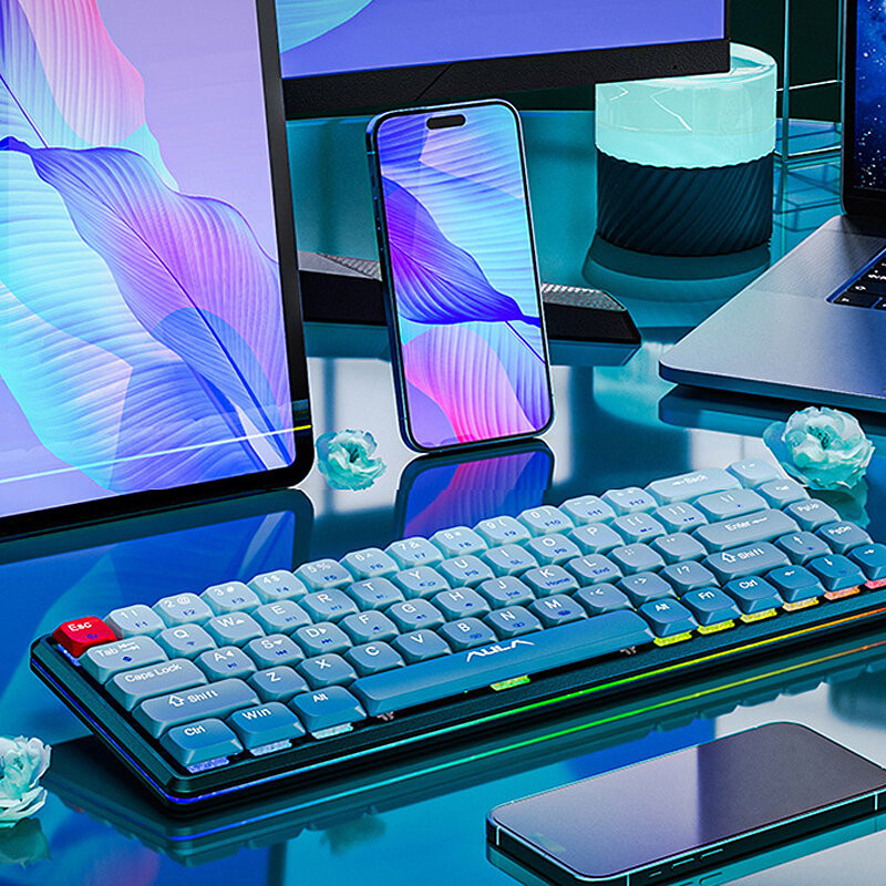 1. Exceptional Connectivity Options: The AULA H68 Mechanical Gaming Keyboard features flexible connectivity options that play a primary factor in improving gaming experiences. It comes with built-in Bluetooth, 2.4G wireless, and a Type-C wired connection. It allows users to connect the keyboard to their gaming setup seamlessly, making it convenient and effortless to use. The wide range of connection options ensures high compatibility with various devices, so you won't need to worry about connection issues. 2. Uniquely Designed Backlight: This keyboard sports an RGB Light Backlight that truly stands out, elevating your gaming environment's aesthetics. The captivating, customizable RGB lighting gives your gaming setup a vibrant, futuristic look and enhances your gaming experience. Every key is separately lit, giving you the freedom to customize the lighting according to your game’s needs or your personal mood. 3. High-Quality Keycaps: The AULA H68 Mechanical Gaming Keyboard comes with PBT keycaps. Known for its superior durability compared to other materials, PBT also provides a more comfortable typing experience. This keyboard is built to stand the test of time, withstanding extensive, demanding gaming sessions. Plus, the 68-key layout is compact yet efficient, offering you a comprehensive gaming control platform. 4. Excellent Battery Capacity: Can't stand having to frequently charge your gaming keyboard? The AULA H68 Mechanical Gaming Keyboard comes with a remarkable 2000mAh battery capacity. It offers longevity to your gaming sessions without the constant worry of losing connection due to low battery. Play endlessly and recharge less, giving you more time to enjoy your gaming sessions. 5. Tactile Blue Switches: Equipped with high-quality Blue switches, the AULA H68 keyboard offers a crisp, tactile response. These switches are known for their sound and feedback, essential for an immersive gaming experience. The heightened responsiveness and accuracy of each keypress enhance performance, which can make the difference between victory or defeat in your games.