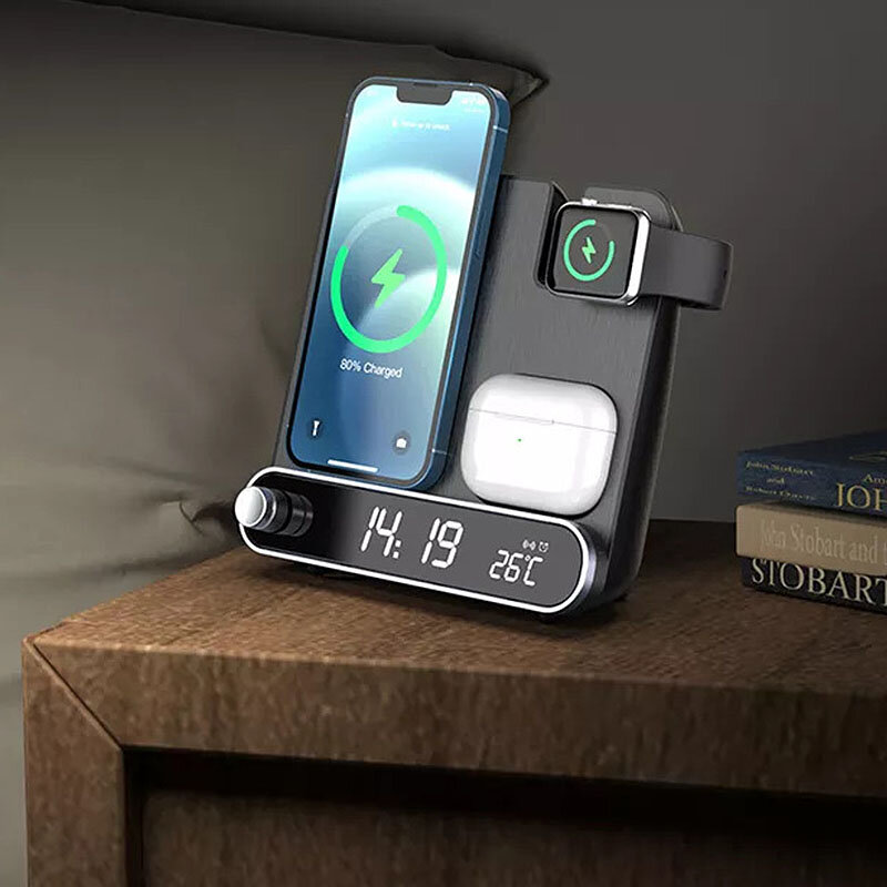 1. Versatile Charging Solution: The HYY-918 is a multi-functional charging dock designed to charge your watch, phone, and earphone simultaneously. 3. Compact and Portable: The compact size and lightweight design make it easy to carry and convenient for travel. 5. Safe and Reliable: Built-in protection mechanisms protect against overheating, overcharging, short-circuits, and other potential risks, ensuring the safety of your devices. 1x Cable 1x Manual