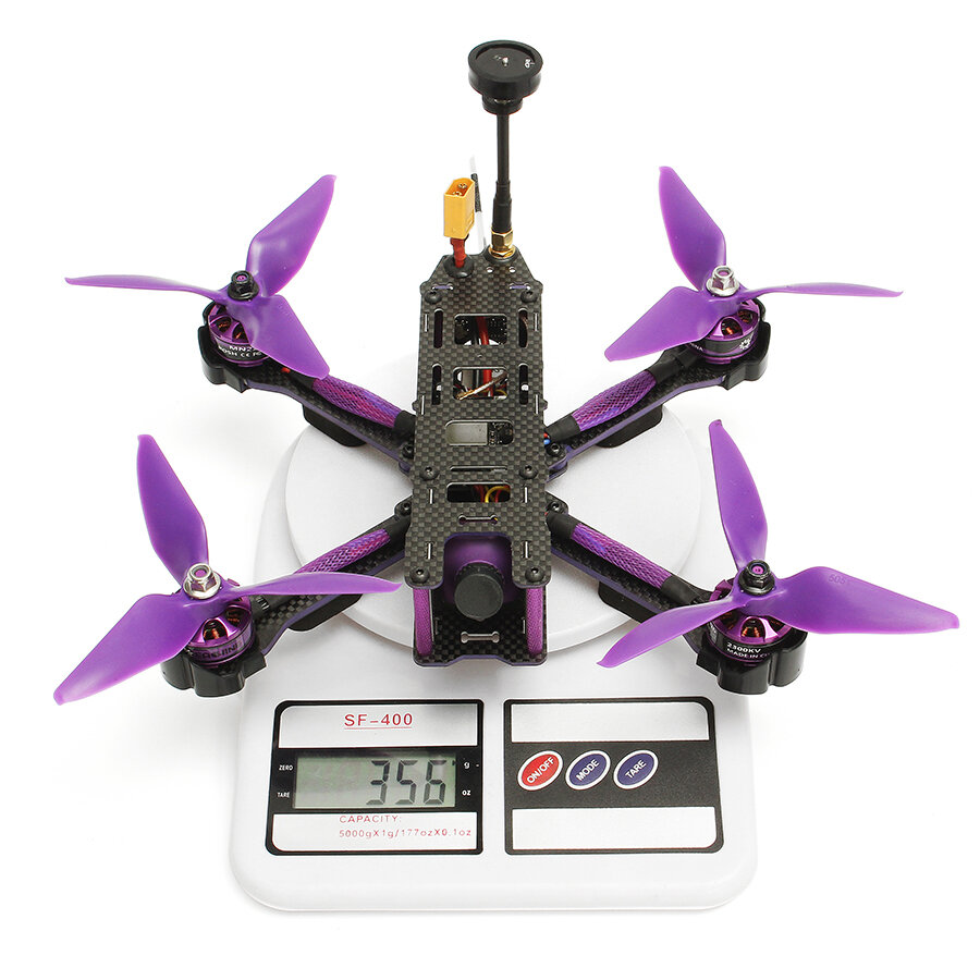 Wheelbase: 220mm 4mm carbon fiber Weigh: 356g (without battery and camera mount) , 4mm thickness and 15mm width frame arms, the width is 10mm less than Eachine Wizard X220.Frame kit with camera angle scale and 30° camera mount for Runcam 3 for Gopro session. Anti-vibration sponges to protect the racer frome crashing.