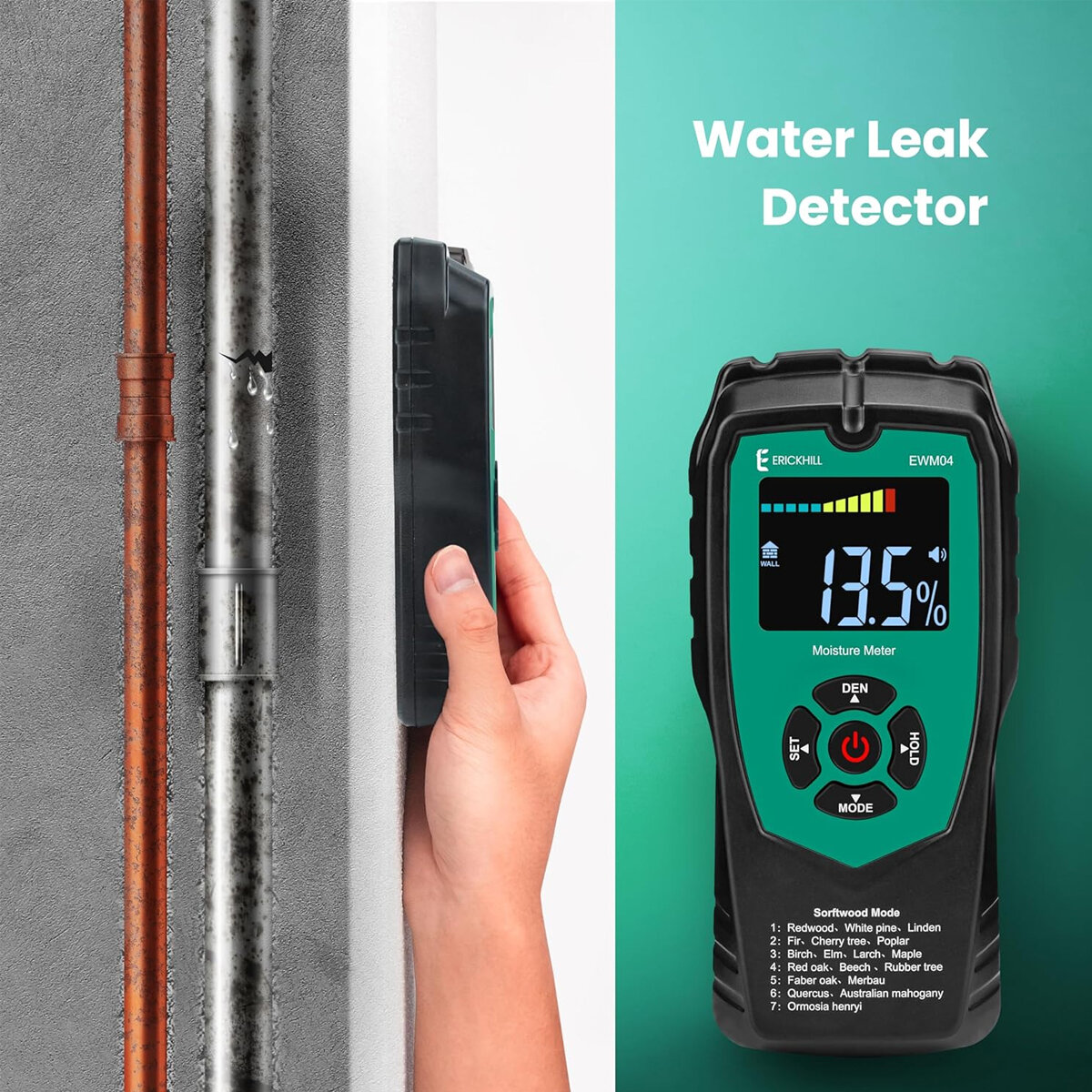 1. Comprehensive Testing Modes: The ERICKHILL moisture meter is equipped with four different measurement modes, capable of analyzing moisture content in various materials such as drywall, masonry, and both softwood and hardwood. 2. Humidity Alert: The added feature of a humidity alert provides a proactive approach to mold detection in your wood materials, enabling you to take early action before serious issues develop. 3. Non-Intrusive Moisture Detection: The meter utilizes a non-invasive method of testing, ensuring no harm comes to the material surface as it succeeds in preserving their original quality and aesthetics. 4. Broad Measuring Range: Offers an impressive measuring range, from 0% to 60% overall, reaching 0% to 100% for specific materials like masonry, and providing a three-color indicator strip for clear visualization of moisture content. 5. Precise Measurements: Outstanding accuracy of ±4% and a maximum measuring depth of 50mm makes it one of the most accurate moisture detectors on the market.