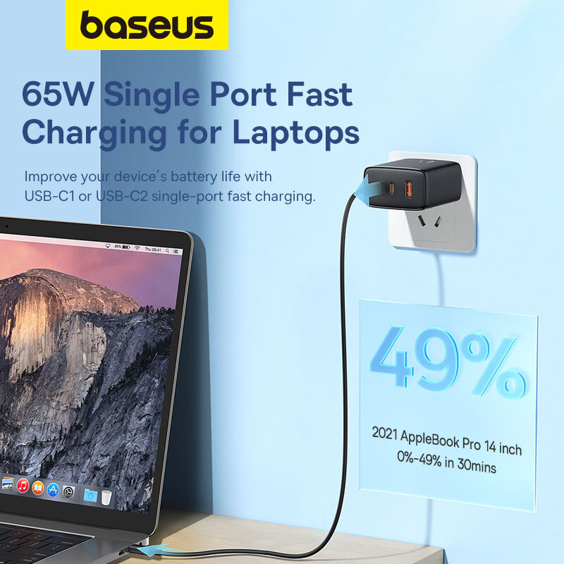 1. High Charging Power: This powerful 65W charger from Baseus can rapidly charge up your devices to save time. 3. Triple-port Design: Equipped with two USB-C and one USB-A port, this charger can power up to three devices concurrently. 5. Superior Material: The charger has been crafted from sturdy and durable PC material for long-lasting use.