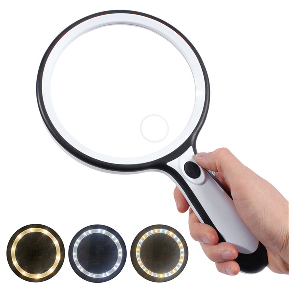 Material: ABS Plastic & Acrylic Optical Lens Type: Handheld Magnifier Effective Diameter: 135mm (main lens), 20mm (auxiliary lens) Dimensions: 280x158x28mm LED Light Source: 20 cold light LEDs, 10 warm light LEDs