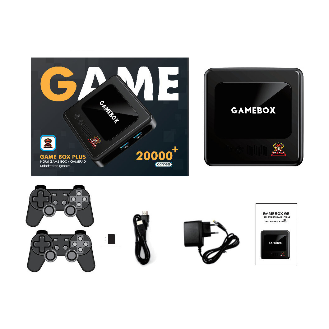 Classic appearance design, smooth texture, rich interface on the game console shell Support 19 major simulators, such as Play 2D, 3D games freely, support 19 major simulator games such as PS1-3, FC, N64, etc. wifi network games can be downloaded at will, 20000 models are waiting for you to play Built-in game search function, the newly upgraded system architecture makes game storage, read and write functions error-free Dual gamepad, sensitive handle, no delay, 2.7 meters long distance transmission You can download games by yourself, and the memory card can be expanded up to 128G Operation System: Emuelec4.3 Language: Support multiple languages (Chinese, English, Japanese, Korean and other 23 languages) Emulator: CP1, CP2, CP3, Neogeo, GBX, MAME, FC, FCE, SFC, GB, GBC, MD, PS1, DC, PS...About 50 CPU: Aigane SDRAM: DDR3 2GB Flash: 8GB Games: 32GB: Preinstalled 10000 games; 128GB: Preinstalled 20000 games Network: IEEE 802.11 a/b/g/n 2.4GHz WIFI Module: REL8189ETV(compatibility RTL8189,AP6330,AP6335) The extended storaoe: SD Card up to 32GB (SD2 XSD3.XSD4.X eMMC ver5.0) Power Supply: DC 12V/1A 3.5mm DC-in HDMI-compatible Output: HDMI-compatible(1.4 and 2.0 to support maximum 4K@60fps) USB Port: 2'USB 2.0 Host Data Output: 0*SPDIF Led work light: support AV Out: 1*AV out Network: 1*RJ45 100M (Gigabit network) Power Supply: 1*DC Jack Camera: Support extemal USB camera 200W 500W(option) Operationg Temperature: -10~50℃ Storage Temperature: -20~70℃ Humidty envronment: 5%-80%(No condensation) Package Included: 1 x TV Game Console 1 x DC Adapter 1 x HDMI Cable 2 x Gamepad 1 x TF Card 1 x User Manual