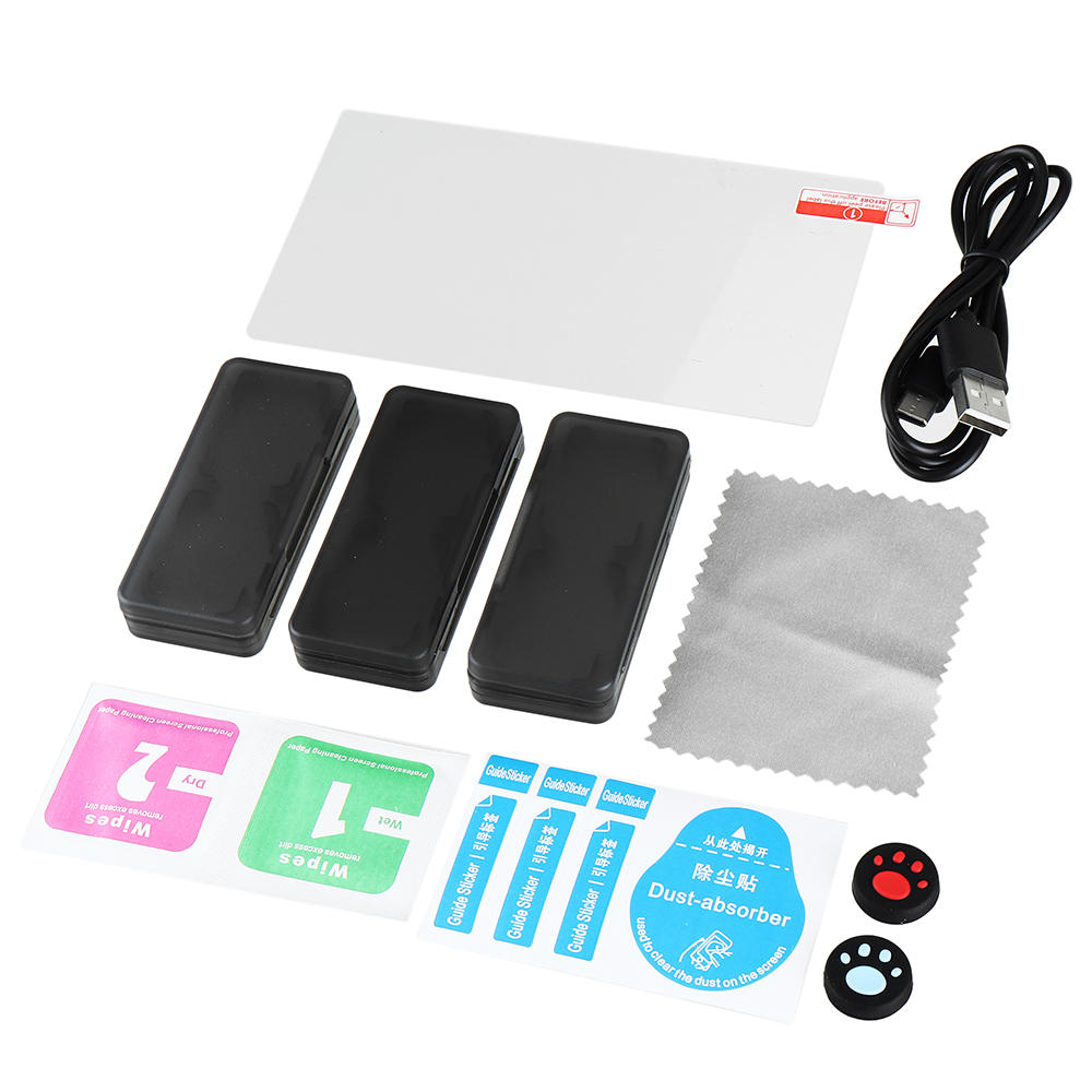 Switch Lite carrying case: can accommodate Switch Lite host, game card, data cable and other gadgets Switch cassette: better collection of your Switch game card Type-C charging cable: charging the host, high quality materials Screen tempered film + cleaning kit: full coverage, anti-scratch anti-fingerprint, high transparency Silicone rocker cap: soft - dirt resistant - wear resistant - excellent hand feel 1 x Portable Bag 1 x Tempered Film 1 x TYPE-C Cable 1 x Cleaning Set 2 x Rocker Cap 3 x Game Card Box
