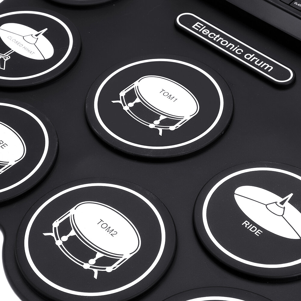 -Portable roll-up electronic drum set, specially designed for drum set learning & practicing of kids or beginners. -With 9 comfortable silicon drum pads, including Tom(3)/Snare/Hi-Hat(2)/Crash/Ride/Kick, making excellent sounds and simulating real beating effect. -Without speaker, you need to connect it with external speaker to enjoy the sound, and in order not to bother others, you can also connect headphones when you play the drum. -Built-in 5 drum set tones and 8 demo songs; with MP3 input for connecting MP3/smartphone/ tablet to playing accompanying music. -Dual power supply choices: 2 * AAA batteries(not included) or powered by computer/ laptop/DC 5V power adapter via the included USB cable. Package List: 1 * Electronic Drum 2 * Drum Sticks 1 * Pedal Set 1 * USB Cable (1.2m) 1 * 3.5mm Audio Cable(0.5m) 1 * User Manual (English) ![]() ![]() ![]() ![]() ![]() ![]() ![]() ![]() ![]() ![]() Hot Products