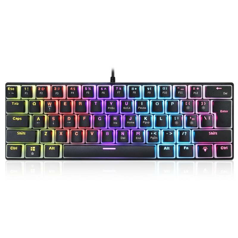 Name: Mechanical Gaming KeyboardKey: 61 KeysBacklight: 12 kinds of lighting effectsInterface: USBSwitch: Cyan switchKeycaps: ABS PuddingWeight: 1000gFunctions: for gaming, office and so on Features: ● Support 12 kinds of Colorful lights lighting effects, creating more fun when playing games.● Ergonomic curved keycaps, smooth lines, scientific debugging, comfortable feel● 21 keys are conflict-free, which can achieve ultimate gaming performance; Let the game flow unimpeded● Translucent design, coupled with Colorful lights keyboard to produce a visual feast of streamers● The pudding key cap is made of high quality ABS material, lamp effect more bright, ABS key cap is not easy to oil particles● Cyan Switch adopted, more stable and easy to use Package Include: 1×Mechanical Keyboard1×Connection Cable