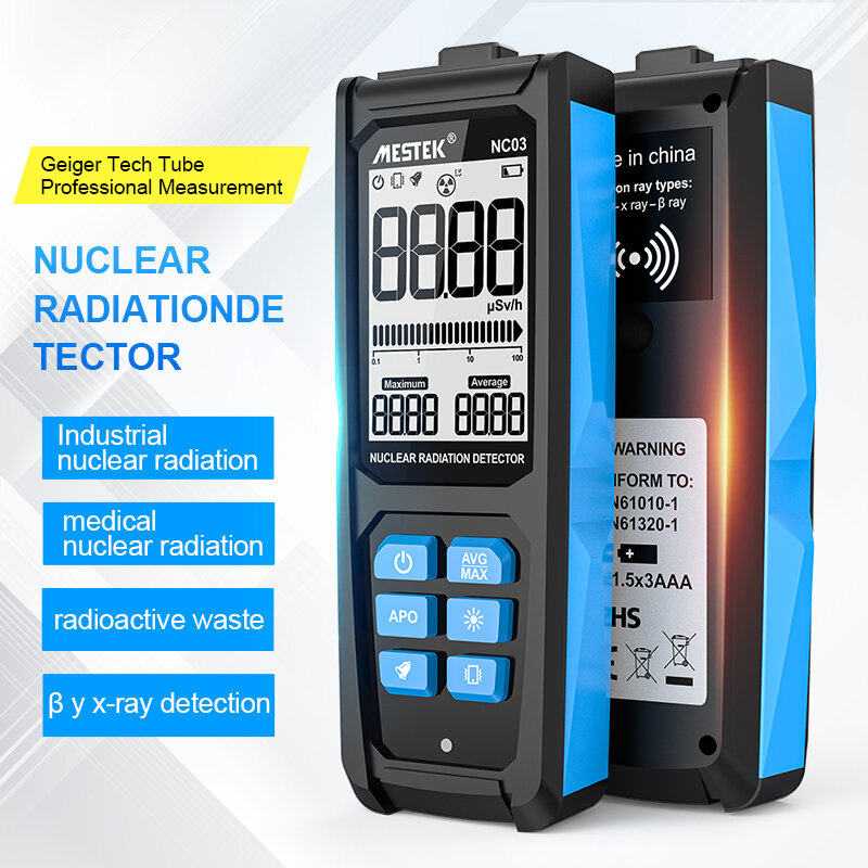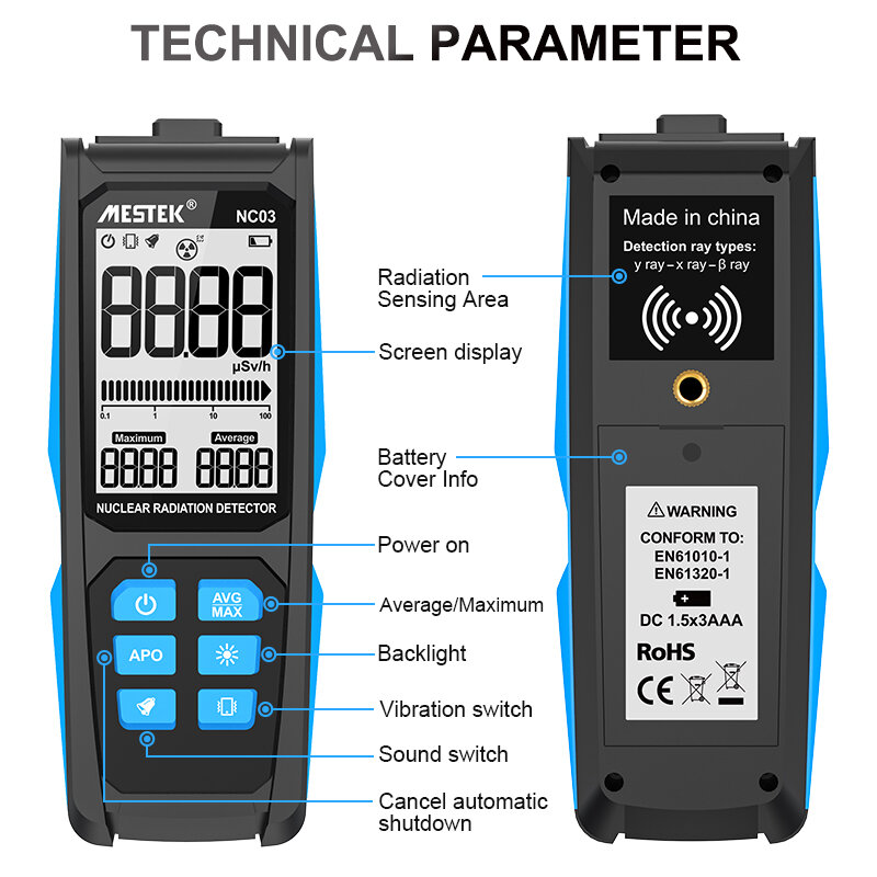 Model: NC03 Probe: Geiger counter tube (J304βy) Types of test Rays: γ-ray, x-ray, β-ray Dose Rate: 0.00-50000uSv/h (10mSv/h) Energy Range: 48keV-1.5Mevs±30% Dosage Unit: uSv/h Charging Voltage: 5V/1A Charging Interface: Type-C Battery Capacity: 2000mAh Alarm Modes: Vibration, Sound, Analog bar Additional Features: Automatic shut-down, Low battery warning, Average/Maximum readings