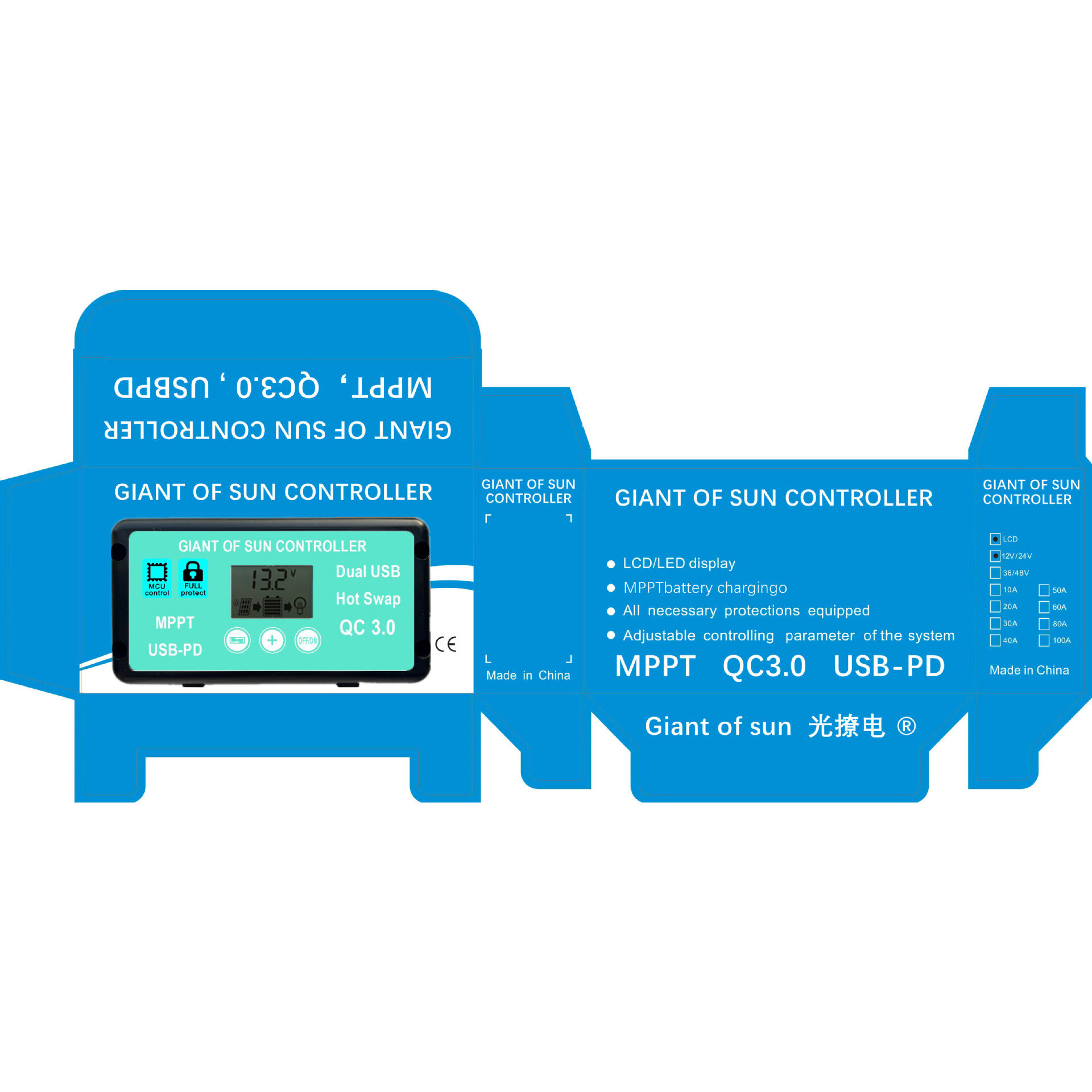 1. The solar controller adopts an industrial-grade main chip Specifications: RV: 12/24VRC: 30/40/50/60/80/100APhotovoltaic voltage: 50VPhotovoltaic input power: 1200W (12V) / 1200W (24V)