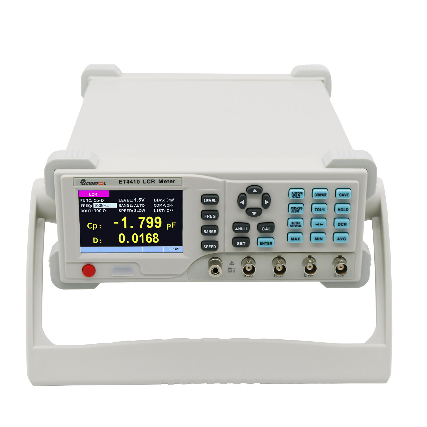 >>Please Click Here to Download the English User Manual<< >>Please click here to buy SMD Clip Probe<< Descriptions: Mustool ET4410 series desktop bridge incorporates 3.5-inch TFT display, user-friendly interface, and a variety of measurement parameters into one body. It is convenient for users to carry out remote control with USB and RS232 and also perform the sorting of components using handle. In function, it can not only adjust the output frequency and test level, but also record the value of components in the process of measurement. In the performance parameters, its basic accuracy reaches 0.2%.