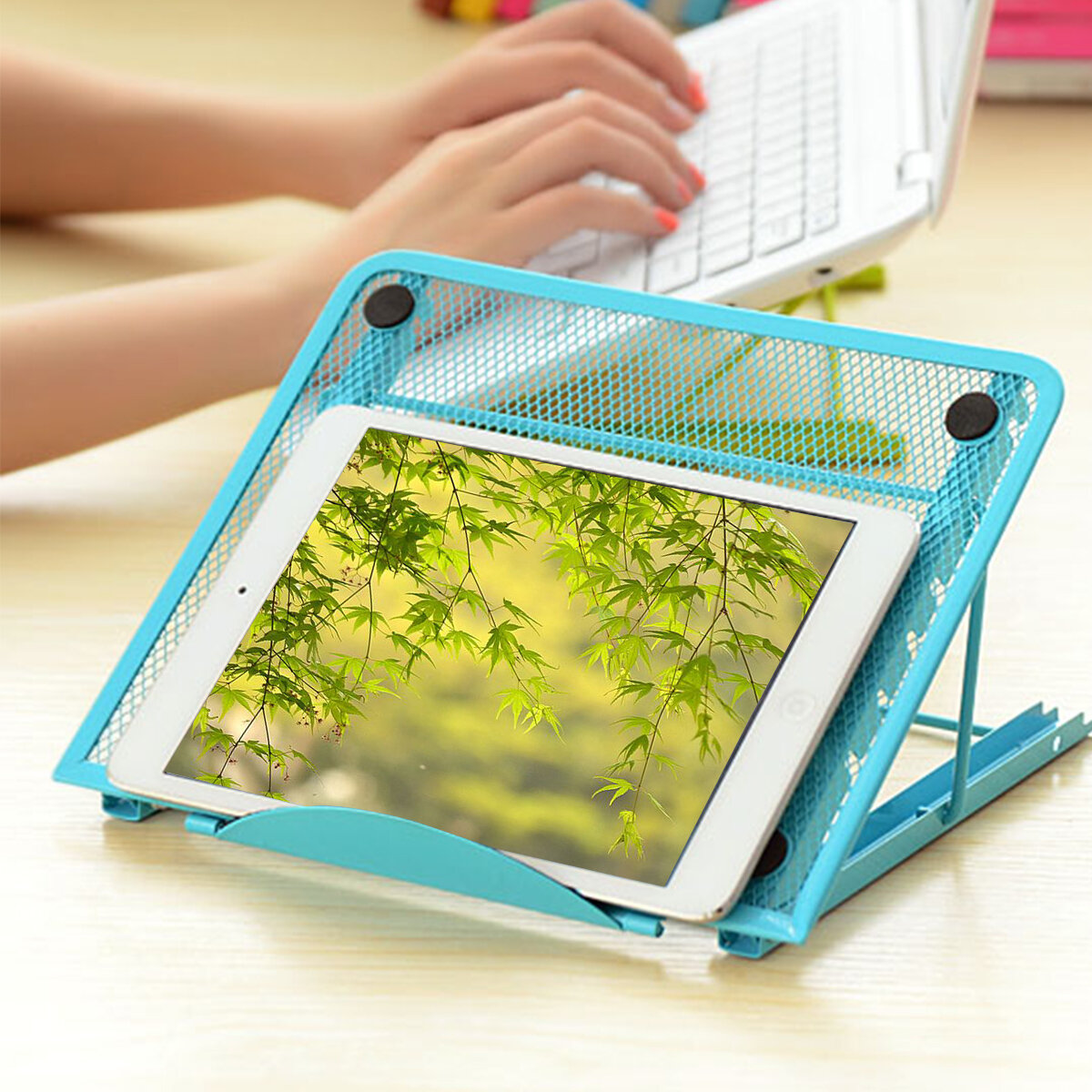 Features:-Ventilated laptop stand helps to keep your laptops running cooler to help prevent hardware damage.-Mesh metal platform helps to draw heat away from laptop / tablet.-Adjustable height for increased airflow and comfortable viewing, reading, and typing.-Can be used with laptops / for tablets and more.Anti-Slip feet keep your laptop in place and protects any surface it is placed on.