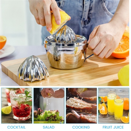 Description: [Safe and sturdy] Our lemon juicer is made of 304 stainless steel. The food-grade stainless steel material ensures that the citrus juicer can be used continuously without food corrosion, the juicer is safe and tasteless, and the enhanced thickness allows you to use it safely. A glass of freshly squeezed juice for breakfast is definitely the best start of the day.[Special Design] This manual juicer is upgraded with bigger capacity, perfect for camping adventures. Measurement markings include cup, oz and ml, which measures, strains, and extracts every drop of juice all at the same time. Conveniently helps you add juice into your delicious food exactly, perfect for fresh juice marinades, flavoring dishes, creating tasty mixed drinks and craft cocktails, and more.[Dishwasher Safe] Our item is also easy to clean. You can remove the juice cover and clean it quickly, Also can be hassle-free clean in dishwasher top rack.[Multi-Size Reamers] The fruit juicer squeezer contains 2 different sizes reamers. No matter small lemons or big oranges, it can help you extract maximum juice. The easy pour spout will not waste any drop of juice.[Handy Lemon Juicer] Hand press juicer doesn’t need electricity. It is convenient to use it at any time and any place. This lemon juicer squeezer's compact design is suitable for travel, party or for any time you need fruit juice.