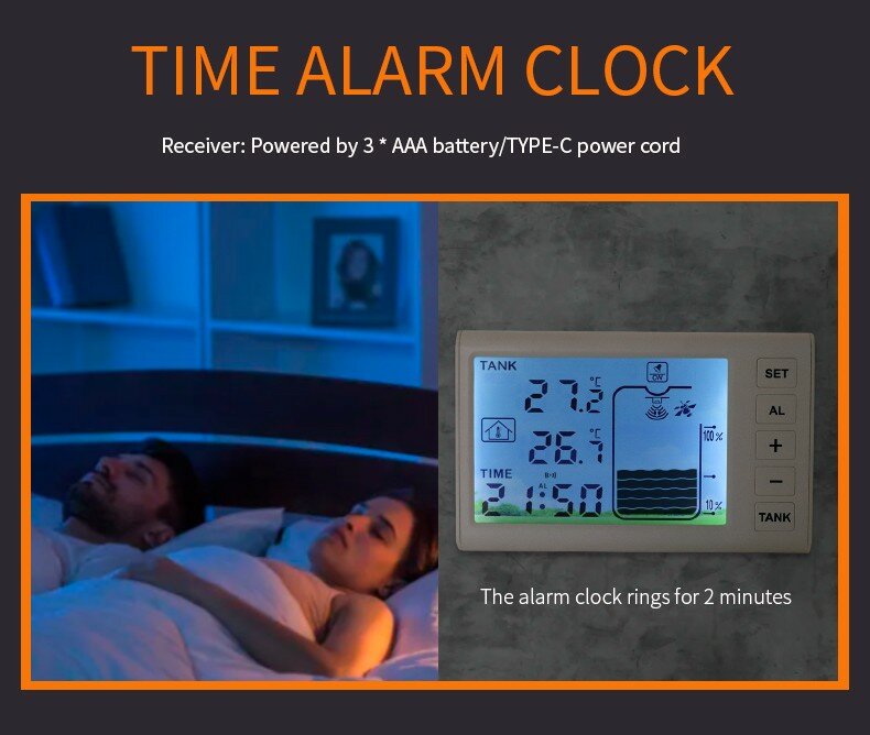 Model: TS-FT001 Material: ABS Color: White Water Pump Control Box: Operating Voltage: AC 110~230V Receiver: Indoor Temperature Range: 0℃~50℃, -32℉~122℉ Resolution: 0.1℃ Accuracy: ±1℃ Water Tank Temperature Range: -40℃~60℃, -40℉~140℉ Alarm Duration: 120 seconds Transmitter: Temperature Resolution: 0.1℃ Accuracy: ±1℃ Water Level Resotion: 0.01m Accuracy: ±0.05m Water Level Measurement Range: 1~5m Battery Usage: Receiver: Power by 3 * AAA 1.5V 900mAh batteries (Not included) / Type-C power cord Receiver Battery Life: 12 months (reference time without backlight activation) Transmitter: Power by 6 * AAA batteries (Not included) (Suggest customers to use rechargeable batteries for convenient solar charging!) Transmitter Battery Life: 12 months (reference time without exposure to sunlight) Receiver Weight: 161g Receiver Size: 13.5 * 2.6 * 8.4cm Transmitter Weight: 137g Transmitter Size: 6.8 * 10.9 * 16.7cm Water Pump Control Box Weight: 134g Pump Control Box Size: 7 * 3.5 * 13cm Package Weight: 633g / 22.32oz Package Size: 14.5 * 12 * 16cm / 5.71 * 4.72 * 6.29in