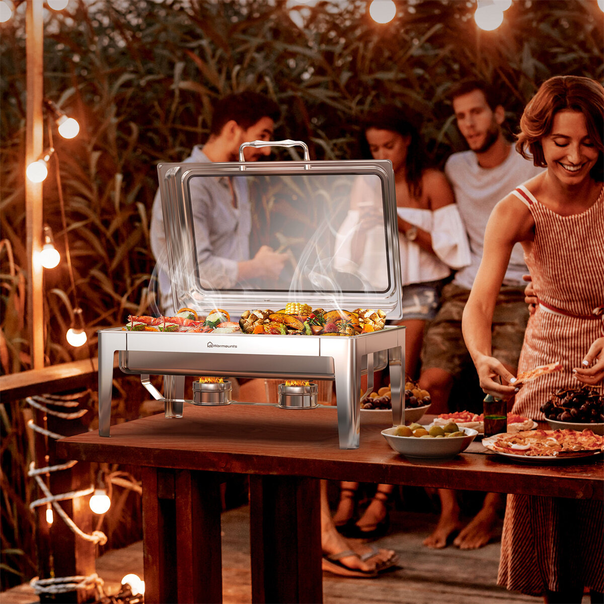 Warmounts 9.5QT Rectangular Chafing Dish Buffet Set with Hydraulic PivotLid, Stainless Steel Catering Server Food Warmer with 2-Tray Noiseless for Party, Wedding, Restaurant
