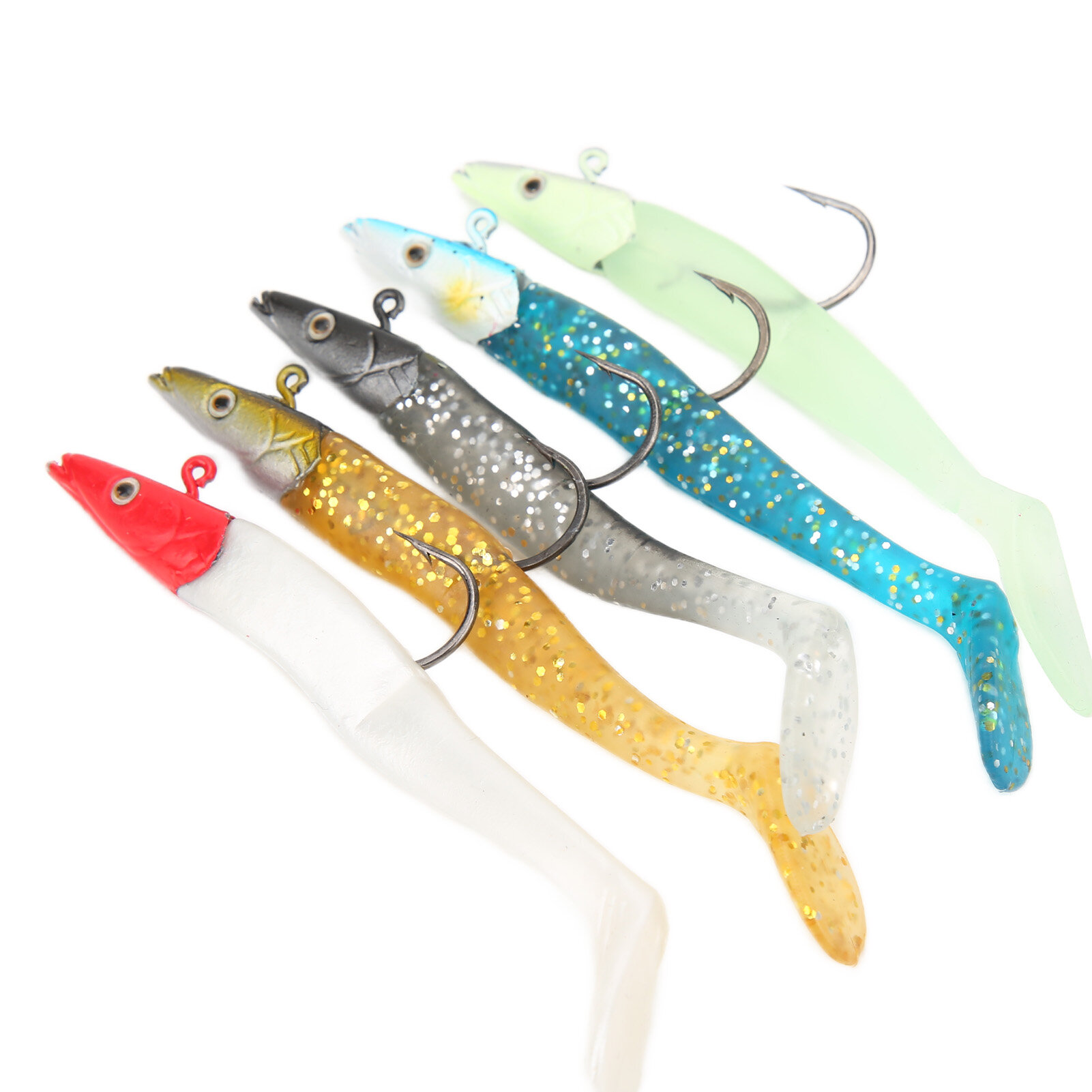 Item Type: Soft Fishing Lures Kit Material: PVC Storage Box size. 11.4*6.2*2.5 CM [Fishing Lures] The fish body is made of PVC material, makes soft and durable, swimming actions. [ Reflectivity] The built in starlight sequins in the fish body have reflectivity, which is for night fishing. [Flexible Lures] The design of the simulated fish is flexibility. [Single Hook] With black nickel high carbon steel single hook, making it easier to fish for fishing lovers. 5 x Soft Fishing Lures 1 x Storage Box